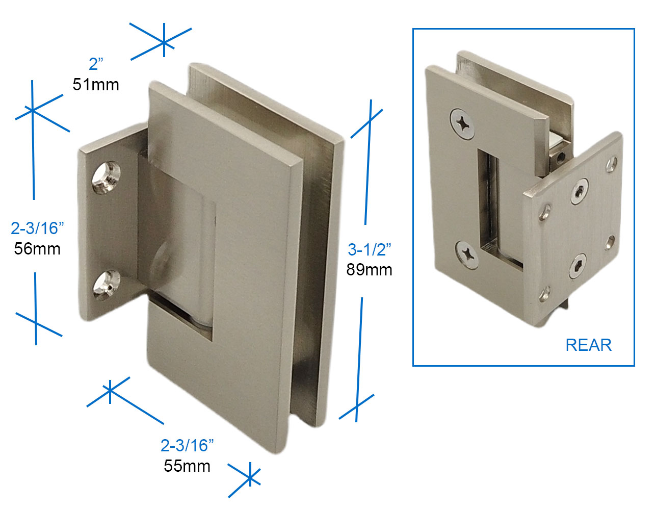 Sometimes you can face the situation when you have to use more hinges for more support. For example, if you use 2 hinges of this kind, with 3/8” to 1/2” glass, then the hinge will hold up to 110lb with the door with up to 36”. If you use 3 hinges with 3/8” to 1/2” glass, the hinge will be able to hold 140lb. with a door width up to 36”.